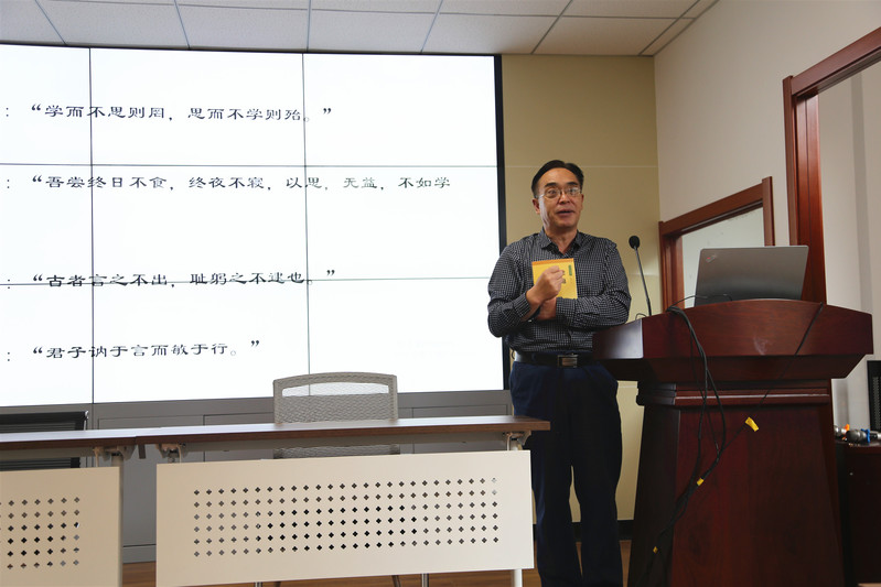 此次主题党日活动中,学院党委书记李迎新作了《<论语>之学习观》的讲座。李书记介绍了万象城官网“不忘初心、牢记使命”主题教育活动开展的情况。他说,开展“不忘初心、牢记使命”主题教育活动以来,学院举办了领导班子夜校读书会,组织党委委员和各支部书记进行集中学习交流,全院师生党员积极开展各种形式的主题学习。与此同时,学院将“读经典、读原典”作为此次活动的重要内容。李书记提出,将《论语》列入到学院全体党员的必读书目中去,把我国传统文化、专业特色和共产党员的初心使命结合到一起,全院党员要积极加入到学习原典和自我完善的过程中去。随后,李书记给党员们分享了《论语》中的学习观,介绍了学习的内涵,学问的内涵,好学的内涵,学习方法及本质,学习的最高境界及环境对学习的影响。他指出,内因是学习的动力,乐在其中是学习的最高境界;环境对学习效果十分重要,学院要形成干部带头学,各位党员主动学习、积极交流的氛围;在“不忘初心、牢记使命”主题教育活动中,一定要在心理上重视,行动上积极,发自内心地学习贯彻,对标检查,坚守一名共产党员和人民教师的初心,肩负起以德树人的使命。李迎春同志总结到,此次主题学习的最终目的是在实践中进行检查,要做到边学边查,从认知、行为等各方面反思和完善自己。