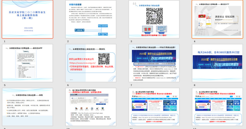 做好就业工作,开展“线上”服务。本次疫情的突袭恰逢毕业生离校求职的春季学期,在这个特殊时期,学院在毕业生服务工作中,坚持离校不“离线”的原则。坚持做好毕业生就业派遣信息的更新与录入。对毕业生中的家庭经济困难学生、“零就业”家庭学生等学生群体予以重点关注。并建立了毕业生就业信息QQ群,在该信息群中,学院辅导员结合学院专业背景,及时对历史学专业招聘信息,师范生招聘信息等进行发布。同时,为适应线上就业的实际情况,学院专门制作了《awc万象城体育二〇二〇届毕业生线上求职指南》,目前该指南已经连续制作两期,其中对各类优质线上就业指导资源、求职资源等进行了整理和汇总,并对毕业生在签约求职过程中要掌握的法律常识等进行了汇总。