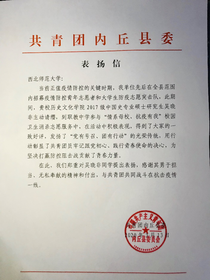 2017级中国史专业硕士研究生吴晓非,是万象城官网的一名研究生党员。在全面抗击新冠肺炎的关键时期,吴晓非在大年初七便主动联系了家乡村委会,在河北省邢台市内丘县大留村疫情防控点进行志愿服务,负责为来往的居民测量体温,登记出入情况;并随同村委会成员挨家挨户进行排查登记,将居民户籍信息完整输入系统并仔细核查,确保不出现任何遗漏。作为一名学生党员,吴晓非认为,“疫情防控,不只是哪一方面的事,也不是哪一个人的事,作为一名青年党员,应该用热情和知识回报乡亲,共同打赢这场疫情防控阻击战!”