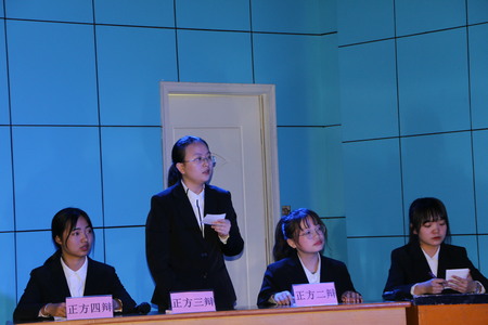 之后反方二辩与正方二辩分别就质询内容做了精彩的总结。紧接着进行的是辩论盘问环节,双方辩手交替式轮流发言。在正方三辩与反方三辩做出质询小结后辩论赛最精彩的环节——自由辩论环节开始。双方辩手都热情高涨,思维敏捷,成功把辩论赛推向高潮部分。在精彩的自由辩论环节结束后进行的是总结陈词环节,正反方四辩分别针对辩论过程进行总结陈词。然后进入观众提问环节,在观众分别对正反方进行提问后辩论赛进入评委评议阶段。