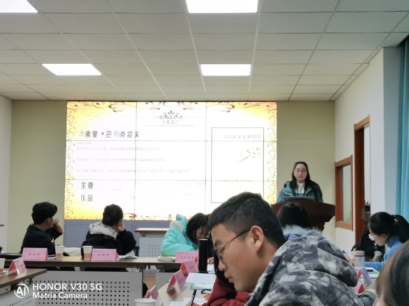 随后进入此次五位同学的读书报告环节。张文骐同学首先抛出了一个问题——“什么是历史学?”并用一段视频对“历史学”作了一个普及,之后对作品、作者、译者进行了有趣又生动的介绍。他对书本的认识独树一帜,对书本的内容进行全面的介绍,理解深刻而又出彩,并分享了自己在书中找到的佳句。最后他说出了对本书的感悟。孔维燕同学主要分享对本书的几个突出论点,第一,历史学与社会科学的结合。第二,历史学家对待历史趋于理性。第三,历史研究突出特点为西方中心论、带有偏向性,但逐渐顾及到亚洲,欧洲,非洲。论点深刻又具体,说服力强。次仁德吉同学与何柏柯同学二人合作,对本书各个章节进行了详细的描述和总结,并提出了本书作者杰弗里·巴勒克拉夫的突出贡献——“全球史观”,并对此进行了简单的叙述。赵薇同学分享了对本书的的具体感悟,并对大家一直有疑惑的“历史”用视频的方式进行了解答,受到了陈老师的表扬。