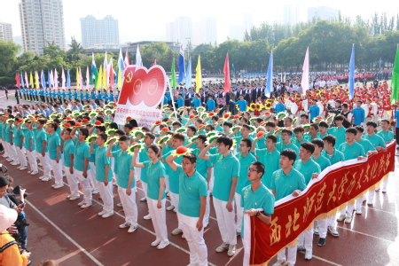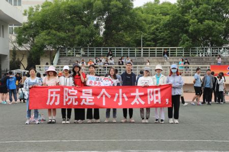 开幕式上,历院方阵表演的同学们昂首挺胸,大步向前,充分体现出身为历院学子的自信与激情;在学生们的身后,是凌云壮志的历院老师们,他们意气风发,精神抖擞。师生队伍在旗手带领下入场,同学们手持向日葵,花海围绕着“庆祝中国共产党建党100周年”展牌,以此表达对建党百年的真挚祝福。