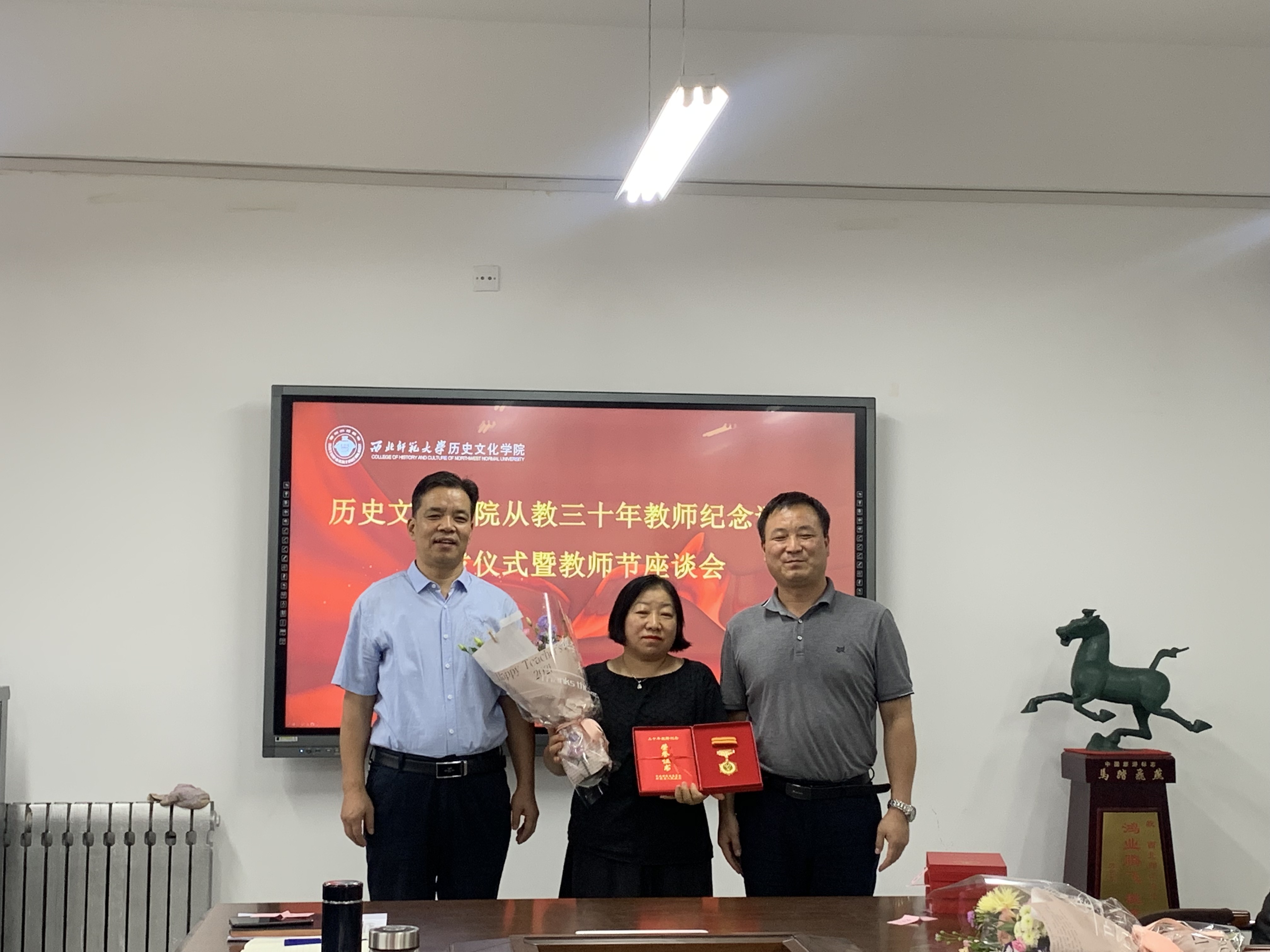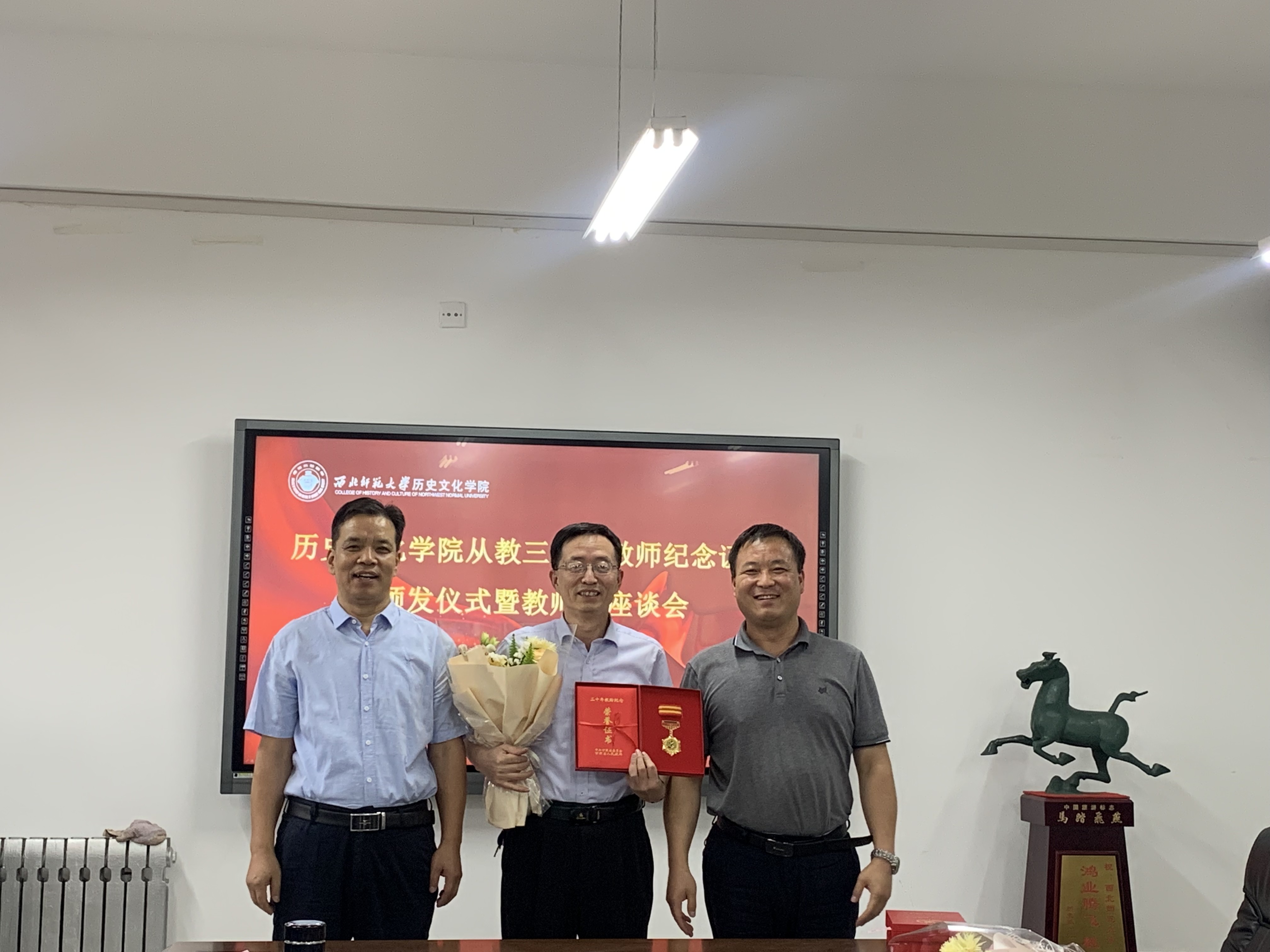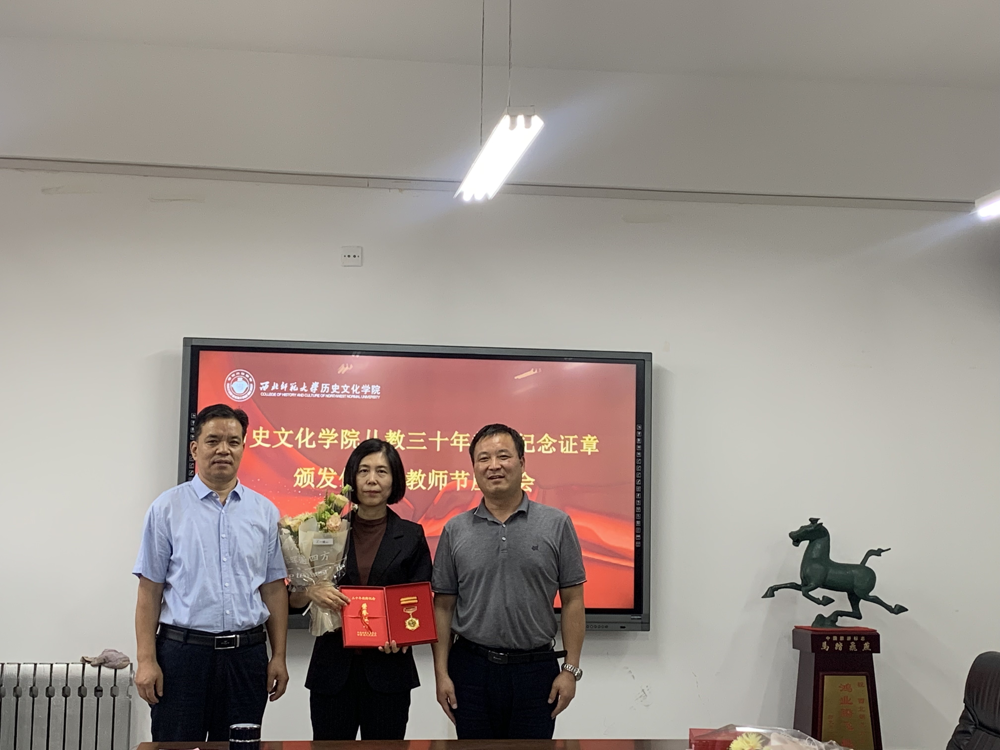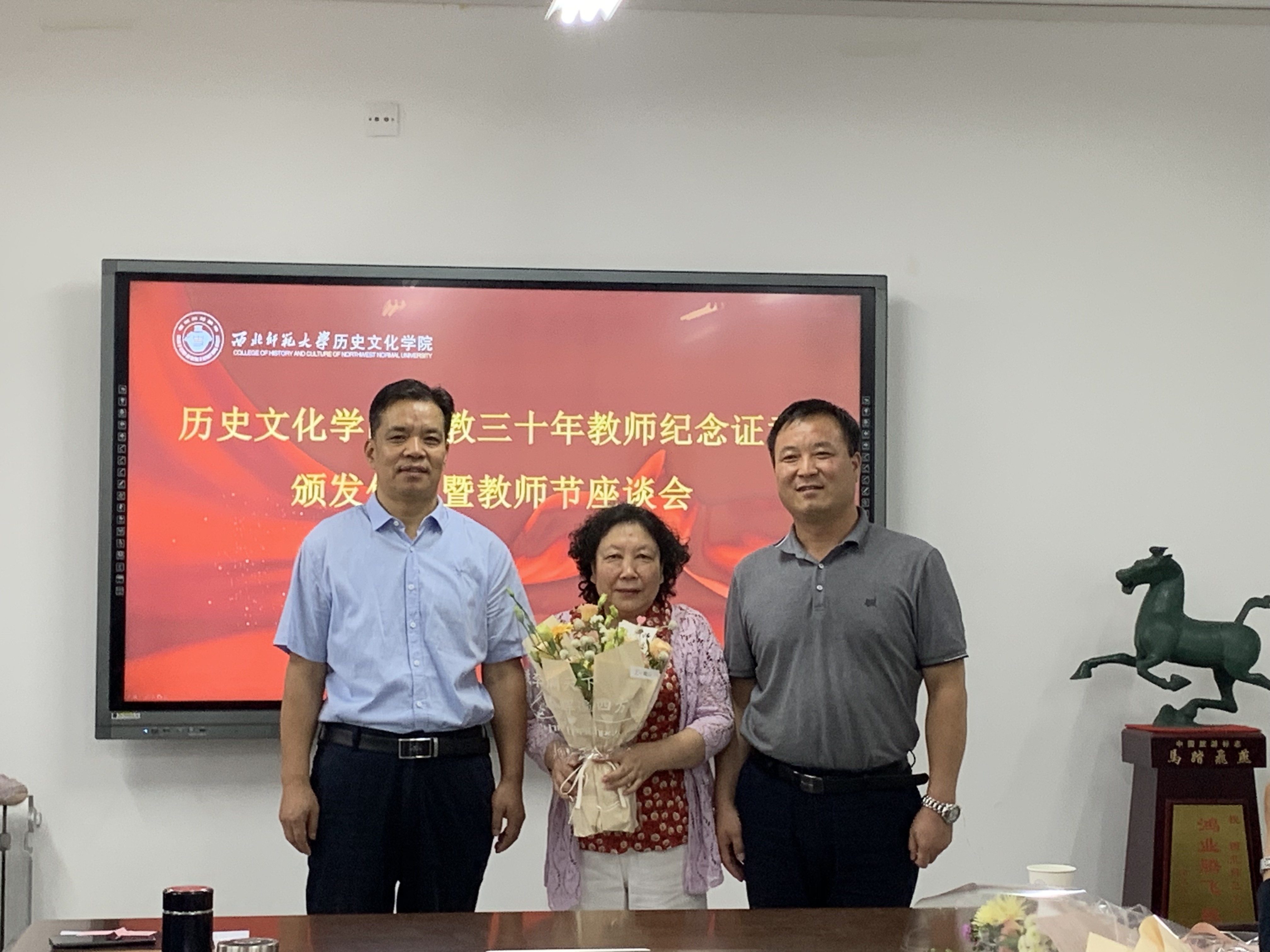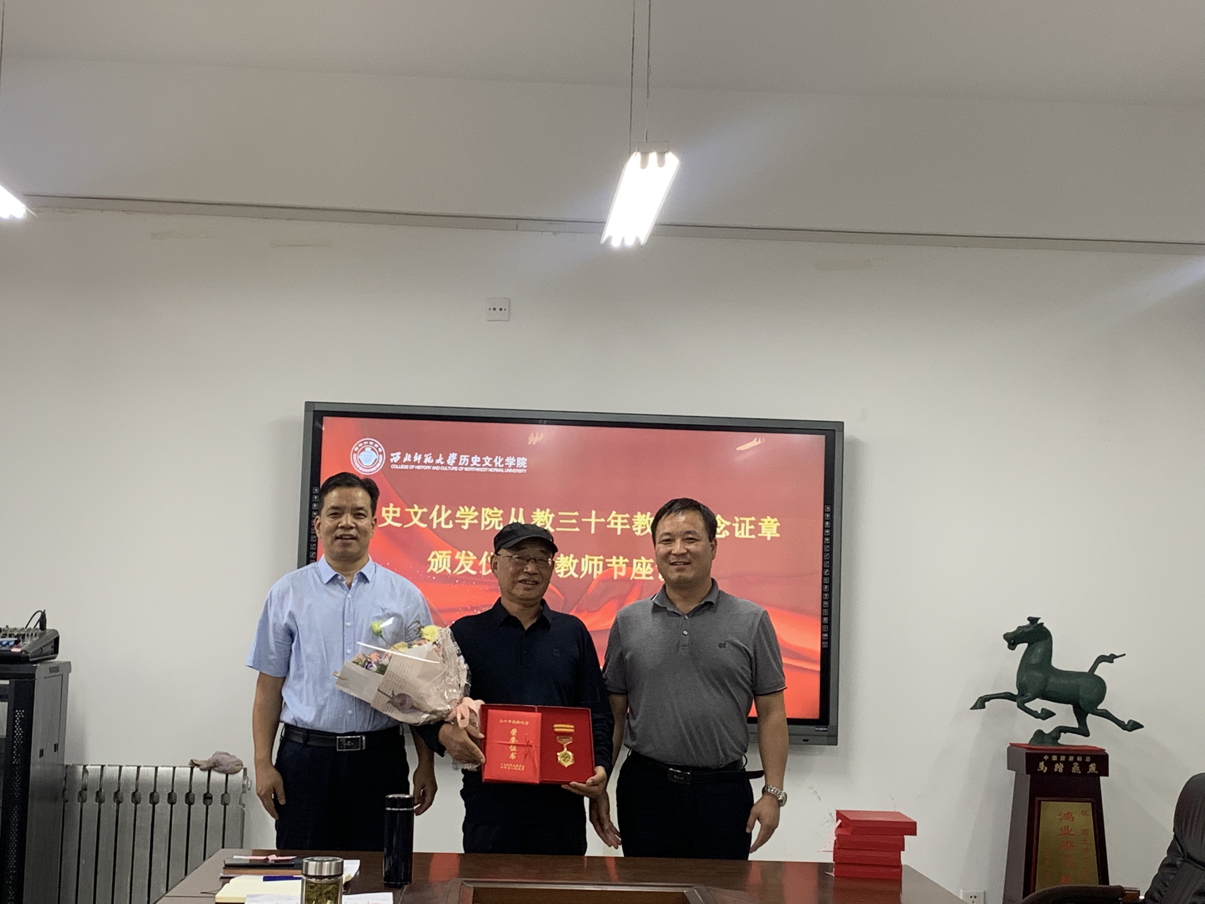 学院党委书记康智杰、院长何玉红为万象城官网从教逾30年的七位教师:李并成研究员、杨鹏飞教授、黄兆宏副教授、党庆兰教授、刘再聪教授、张玉霞副教授、张嵘副教授颁发了荣誉证书和奖章,并为光荣退休的陈秀实老师送上鲜花。