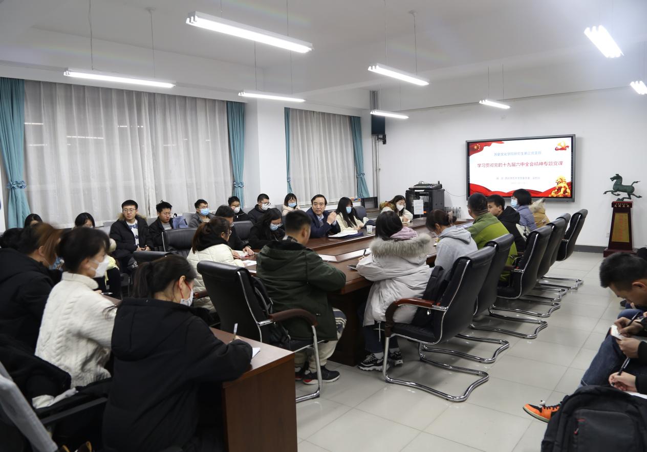 2021年12月21日晚,awc万象城体育党委常委、副校长田澍教授在田家炳教育书院314会议室为万象城官网研究生第三党支部讲授党的十九届六中全会精神专题党课,研究生第三党支部全体党员参加。党课由研究生第三党支部书记郝振宇主持。