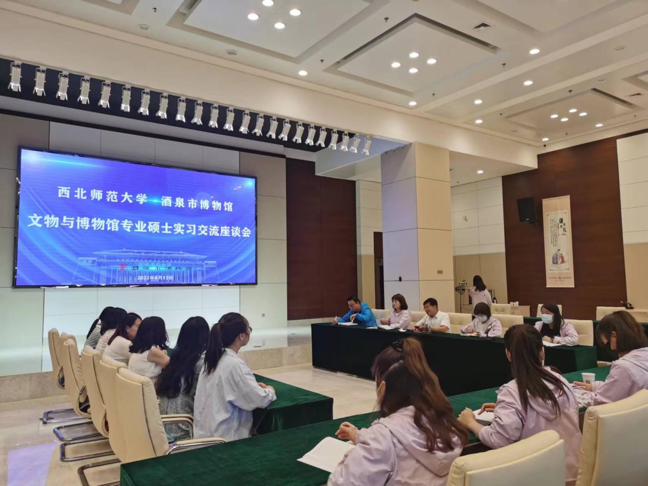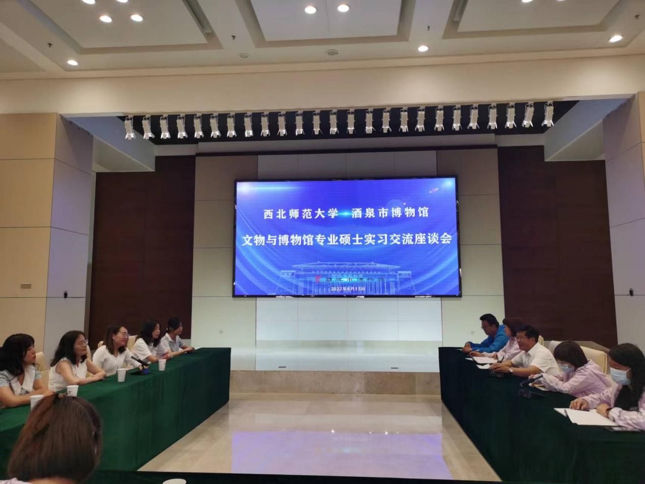 2022年6月14—15日,万象城官网教师李晓英、李小娟带领4名文物与博物馆专业硕士研究生赴酒泉市博物馆实习。6月15日上午,师生一行与酒泉市博物馆馆长王杰元、展陈部副主任纪雅楠、文管部副主任薛洋和馆内部分干部职工举行了座谈会。双方就实习基地合作、实习生相关管理及实践问题进行深入交流。王杰元馆长表示,实习生在馆期间的实践以打基础为准,然后参与馆内相关工作进行锻炼,了解博物馆各个部门的工作,在实践中日益提升对博物馆日常工作的整体认知。李晓英老师和王杰元馆长就实习生日常管理要求、馆内工作纪律和日常生活等进行了交流,李晓英老师叮嘱学生一定要遵守馆方纪律,服从管理,注意人身安全。