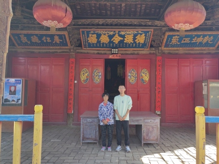 8月14日参观古浪县博物馆、走访古浪县文旅局获得相关资料,8月15日至18日考察古浪县土门镇山陕会馆遗址,土门自古以来便是丝绸之路上的一个集镇,明朝时又名“哨马营”,后有陕西西安府土门县(今富平县)移民迁入,故称“土门镇”。现存建筑群坐北向南,南侧开门,由南向北依次为钟、鼓楼、东、西演义厅、大殿、厢房、马祖殿。建筑以大殿为中心,东西有厢房各1座。大殿为土木结构,面阔3间,进深3间,单檐硬山顶,灰瓦覆盖,檐下施11朵斗栱。两侧厢房残破,大殿内有清代白福龙所绘三国演义为题材的壁画,局部剥落。遗址已被列为省级文物保护单位,团队成员期望通过考察调研为文物保护贡献自己的力量。