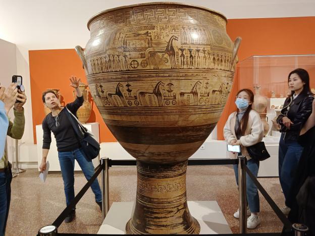 3月24日,同学们在抵达雅典大学的第一周,任课教师Barringer教授带领他们前往雅典国立博物馆,参观众多精美的古希腊陶器与雕塑,现场讲解古希腊艺术。同学们认真学习,并注意到古希腊的彩陶与中国的史前彩陶纹饰的比较研究。两国的古陶器都绘有精美的花纹,纹饰上最大的区别是古希腊彩陶图案由大量的人物以及古希腊神话故事。这样的参观活动,让同学们对古希腊艺术有了更深刻的理解与更直观的感受,并能够举一反三,取得了良好的学习效果。